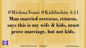 Kiddushin, MishnaYomi #MishnaYomi #Kiddushin 4:11 Date: November 9, 2018Author: ysspitz #MishnaYomi #Kiddushin 4:11 Man married overseas, returns, says this is my wife & kids, must prove marriage, but not kids. Share this: Share on X (Opens in new window) X Share on Facebook (Opens in new window) Facebook Like Loading... Related