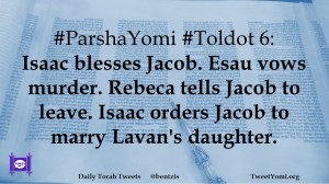 #ParshaYomi #Toldot 6: Isaac blesses Jacob. Esau vows murder. Rebeca tells Jacob to leave. Isaac orders Jacob to marry Lavan’s daughter.