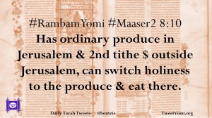 #RambamYomi #Maaser2 8:10 Has ordinary produce in Jerusalem & 2nd tithe $ outside Jerusalem, can switch holiness to the produce & eat there.