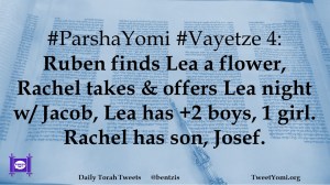 #ParshaYomi #Vayetze 4: Ruben finds Lea a flower, Rachel takes & offers Lea night w/ Jacob, Lea has +2 boys, 1 girl. Rachel has son, Josef.