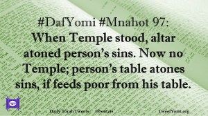 DafYomi, Mnahot #DafYomi #Mnahot 97 Date: November 15, 2018Author: ysspitz #DafYomi #Mnahot 97: When Temple stood, altar atoned person’s sins. Now no Temple; person’s table atones sins, if feeds poor from his table. Share this: Share on X (Opens in new window) X Share on Facebook (Opens in new window) Facebook Like Loading... Related