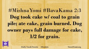 #MishnaYomi #BavaKama 2:3 Dog took cake w/ coal to grain pile; ate cake, grain burned. Dog owner pays full damage for cake, 1/2 for grain.
