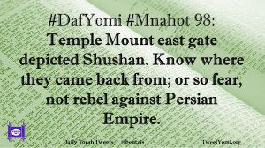 DafYomi, Mnahot #DafYomi #Mnahot 98 Date: November 16, 2018Author: ysspitz #DafYomi #Mnahot 98: Temple Mount east gate depicted Shushan. Know where they came back from; or so fear, not rebel against Persian Empire. Share this: Share on X (Opens in new window) X Share on Facebook (Opens in new window) Facebook Like Loading... Related