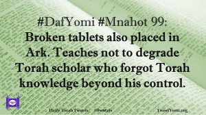 DafYomi, Mnahot #DafYomi #Mnahot 99 Date: November 16, 2018Author: ysspitz #DafYomi #Mnahot 99: Broken tablets also placed in Ark. Teaches not to degrade Torah scholar who forgot Torah knowledge beyond his control. Share this: Share on X (Opens in new window) X Share on Facebook (Opens in new window) Facebook Like Loading... Related