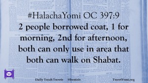 #HalachaYomi OC 397:9 2 people borrowed coat, 1 for morning, 2nd for afternoon, both can only use in area that both can walk on Shabat.