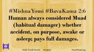 #MishnaYomi #BavaKama 2:6 Human always considered Muad (habitual damager) whether accident, on purpose, awake or asleep; pays full damages.