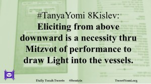 TanyaYomi #TanyaYomi 8Kislev Date: November 16, 2018Author: ysspitz #TanyaYomi 8Kislev: Eliciting from above downward is a necessity thru Mitzvot of performance to draw Light into the vessels. Share this: Share on X (Opens in new window) X Share on Facebook (Opens in new window) Facebook Like Loading... Related