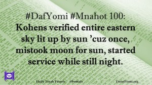 DafYomi, Mnahot #DafYomi #Mnahot 100 Date: November 18, 2018Author: ysspitz #DafYomi #Mnahot 100: Kohens verified entire eastern sky lit up by sun ‘cuz once, mistook moon for sun, started service while still night. Share this: Share on X (Opens in new window) X Share on Facebook (Opens in new window) Facebook Like Loading... Related