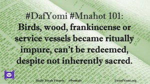DafYomi, Mnahot #DafYomi #Mnahot 101 Date: November 19, 2018Author: ysspitz #DafYomi #Mnahot 101: Birds, wood, frankincense or service vessels became ritually impure, can’t be redeemed, despite not inherently sacred. Share this: Share on X (Opens in new window) X Share on Facebook (Opens in new window) Facebook Like Loading... Related