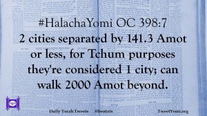 #HalachaYomi OC 398:7 2 cities separated by 141.3 Amot or less, for Tchum purposes they’re considered 1 city; can walk 2000 Amot beyond.