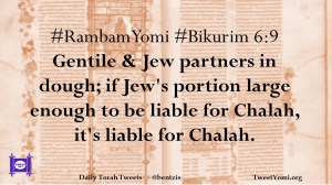 #RambamYomi #Bikurim 6:9 Gentile & Jew partners in dough; if Jew’s portion large enough to be liable for Chalah, it’s liable for Chalah.