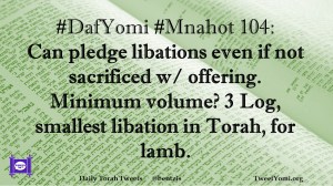 DafYomi, Mnahot #DafYomi #Mnahot 104 Date: November 22, 2018Author: ysspitz #DafYomi #Mnahot 104: Can pledge libations even if not sacrificed w/ offering. Minimum volume? 3 Log, smallest libation in Torah, for lamb. Share this: Share on X (Opens in new window) X Share on Facebook (Opens in new window) Facebook Like Loading... Related