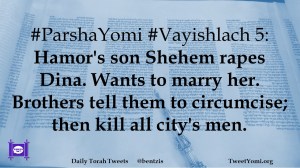 #ParshaYomi #Vayishlach 5: Hamor’s son Shehem rapes Dina. Wants to marry her. Brothers tell them to circumcise; then kill all city’s men.