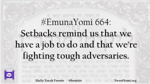 EmunaYomi #EmunaYomi 664 Date: November 23, 2018Author: ysspitz #EmunaYomi 664: Setbacks remind us that we have a job to do and that we’re fighting tough adversaries. Share this: Share on X (Opens in new window) X Share on Facebook (Opens in new window) Facebook Like Loading... Related