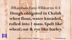 #RambamYomi #Bikurim 8:4 Dough obligated in Chalah when flour, water kneaded, rolled into 1 mass. Spelt like wheat; oat & rye like barley.