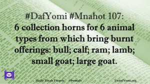 DafYomi, Mnahot #DafYomi #Mnahot 107 Date: November 25, 2018Author: ysspitz #DafYomi #Mnahot 107: 6 collection horns for 6 animal types from which bring burnt offerings: bull; calf; ram; lamb; small goat; large goat. Share this: Share on X (Opens in new window) X Share on Facebook (Opens in new window) Facebook Like Loading... Related