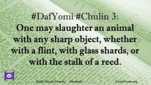 Chulin, DafYomi #DafYomi #Chulin 3 Date: November 30, 2018Author: ysspitz #DafYomi #Chulin 3: One may slaughter an animal with any sharp object, whether with a flint, with glass shards, or with the stalk of a reed. Share this: Share on X (Opens in new window) X Share on Facebook (Opens in new window) Facebook Like Loading... Related