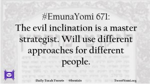 EmunaYomi #EmunaYomi 671 Date: November 30, 2018Author: ysspitz #EmunaYomi 671: The evil inclination is a master strategist. Will use different approaches for different people. Share this: Share on X (Opens in new window) X Share on Facebook (Opens in new window) Facebook Like Loading... Related