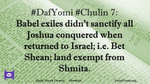 Chulin, DafYomi #DafYomi #Chulin 7 Date: December 4, 2018Author: ysspitz #DafYomi #Chulin 7: Babel exiles didn’t sanctify all Joshua conquered when returned to Israel; i.e. Bet Shean; land exempt from Shmita. Share this: Share on X (Opens in new window) X Share on Facebook (Opens in new window) Facebook Like Loading... Related