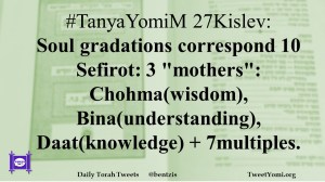 #TanyaYomiM 27Kislev: Soul gradations correspond 10 Sefirot: 3 “mothers”: Chohma(wisdom), Bina(understanding), Daat(knowledge) + 7multiples.