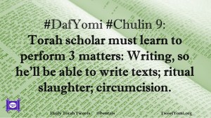 Chulin, DafYomi #DafYomi #Chulin 9 Date: December 6, 2018Author: ysspitz #DafYomi #Chulin 9: Torah scholar must learn to perform 3 matters: Writing, so he’ll be able to write texts; ritual slaughter; circumcision. Share this: Share on X (Opens in new window) X Share on Facebook (Opens in new window) Facebook Like Loading... Related