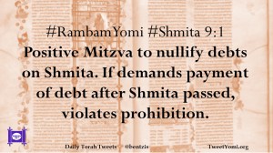 #RambamYomi #Shmita 9:1 Positive Mitzva to nullify debts on Shmita. If demands payment of debt after Shmita passed, violates prohibition.