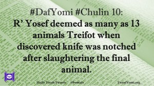 Chulin, DafYomi #DafYomi #Chulin 10 Date: December 7, 2018Author: ysspitz #DafYomi #Chulin 10: R’ Yosef deemed as many as 13 animals Treifot when discovered knife was notched after slaughtering the final animal. Share this: Share on X (Opens in new window) X Share on Facebook (Opens in new window) Facebook Like Loading... Related