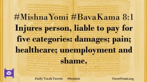 #MishnaYomi #BavaKama 8:1 Injures person, liable to pay for five categories: damages; pain; healthcare; unemployment and shame.