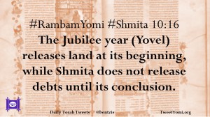 #RambamYomi #Shmita 10:16 The Jubilee year (Yovel) releases land at its beginning, while Shmita does not release debts until its conclusion.