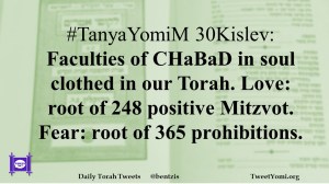 #TanyaYomiM 30Kislev: Faculties of CHaBaD in soul clothed in our Torah. Love: root of 248 positive Mitzvot. Fear: root of 365 prohibitions.