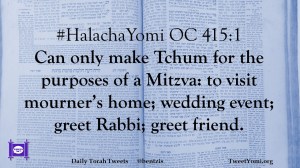#HalachaYomi OC 415:1 Can only make Tchum for the purposes of a Mitzva: to visit mourner’s home; wedding event; greet Rabbi; greet friend.