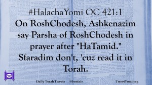 #HalachaYomi OC 421:1 On RoshChodesh, Ashkenazim say Parsha of RoshChodesh in prayer after “HaTamid.” Sfaradim don’t, ‘cuz read it in Torah.