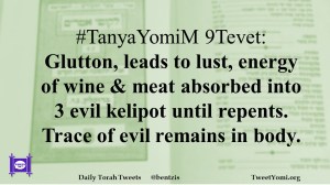 #TanyaYomiM 9Tevet: Glutton, leads to lust, energy of wine & meat absorbed into 3 evil kelipot until repents. Trace of evil remains in body.