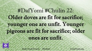 Chulin, DafYomi #DafYomi #Chulin 22 Date: December 19, 2018Author: ysspitz #DafYomi #Chulin 22: Older doves are fit for sacrifice; younger one are unfit. Younger pigeons are fit for sacrifice; older ones are unfit. Share this: Share on X (Opens in new window) X Share on Facebook (Opens in new window) Facebook Like Loading... Related