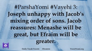 #ParshaYomi #Vayehi 3: Joseph unhappy with Jacob’s mixing order of sons. Jacob reassures: Menashe will be great, but Efraim will be greater.