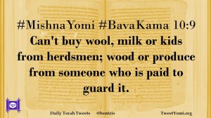 BavaKama, MishnaYomi #MishnaYomi #BavaKama 10:9 Date: December 20, 2018Author: ysspitz #MishnaYomi #BavaKama 10:9 Can’t buy wool, milk or kids from herdsmen; wood or produce from someone who is paid to guard it. Share this: Share on X (Opens in new window) X Share on Facebook (Opens in new window) Facebook Like Loading... Related