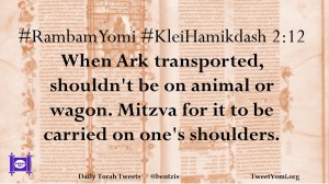 #RambamYomi #KleiHamikdash 2:12 When Ark transported, shouldn’t be on animal or wagon. Mitzva for it to be carried on one’s shoulders.
