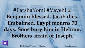 #ParshaYomi #Vayehi 6: Benjamin blessed. Jacob dies. Embalmed. Egypt mourns 70 days. Sons bury him in Hebron. Brothers afraid of Joseph.