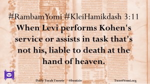 #RambamYomi #KleiHamikdash 3:11 When Levi performs Kohen’s service or assists in task that’s not his, liable to death at the hand of heaven.