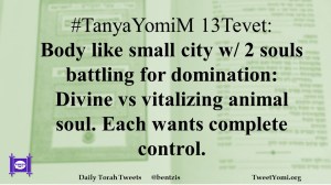 #TanyaYomiM 13Tevet: Body like small city w/ 2 souls battling for domination: Divine vs vitalizing animal soul. Each wants complete control.