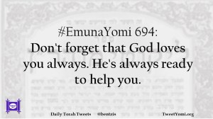EmunaYomi #EmunaYomi 694 Date: December 23, 2018Author: ysspitz #EmunaYomi 694: Don’t forget that God loves you always. He’s always ready to help you. Share this: Share on X (Opens in new window) X Share on Facebook (Opens in new window) Facebook Like Loading... Related