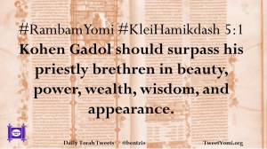#RambamYomi #KleiHamikdash 5:1 Kohen Gadol should surpass his priestly brethren in beauty, power, wealth, wisdom, and appearance.