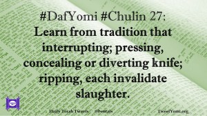 Chulin, DafYomi #DafYomi #Chulin 27 Date: December 24, 2018Author: ysspitz #DafYomi #Chulin 27: Learn from tradition that interrupting; pressing, concealing or diverting knife; ripping, each invalidate slaughter. Share this: Share on X (Opens in new window) X Share on Facebook (Opens in new window) Facebook Like Loading... Related