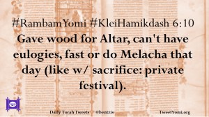 #RambamYomi #KleiHamikdash 6:10 Gave wood for Altar, can’t have eulogies, fast or do Melacha that day (like w/ sacrifice: private festival).