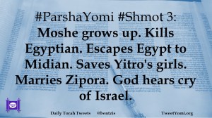 #ParshaYomi #Shmot 3: Moshe grows up. Kills Egyptian. Escapes Egypt to Midian. Saves Yitro’s girls. Marries Zipora. God hears cry of Israel.