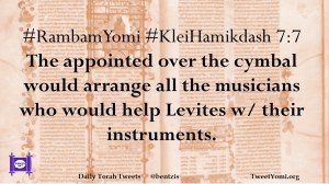 #RambamYomi #KleiHamikdash 7:7 The appointed over the cymbal would arrange all the musicians who would help Levites w/ their instruments.