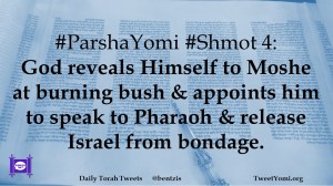 #ParshaYomi #Shmot 4: God reveals Himself to Moshe at burning bush & appoints him to speak to Pharaoh & release Israel from bondage.
