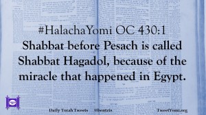 HalachaYomi #HalachaYomi OC 430:1 Date: December 27, 2018Author: ysspitz #HalachaYomi OC 430:1 Shabbat before Pesach is called Shabbat Hagadol, because of the miracle that happened in Egypt. Share this: Share on X (Opens in new window) X Share on Facebook (Opens in new window) Facebook Like Loading... Related