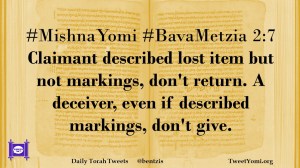 #MishnaYomi #BavaMetzia 2:7 Claimant described lost item but not markings, don’t return. A deceiver, even if described markings, don’t give.