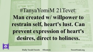 #TanyaYomiM 21Tevet: Man created w/ willpower to restrain self, heart’s lust. Can prevent expression of heart’s desires, direct to holiness.
